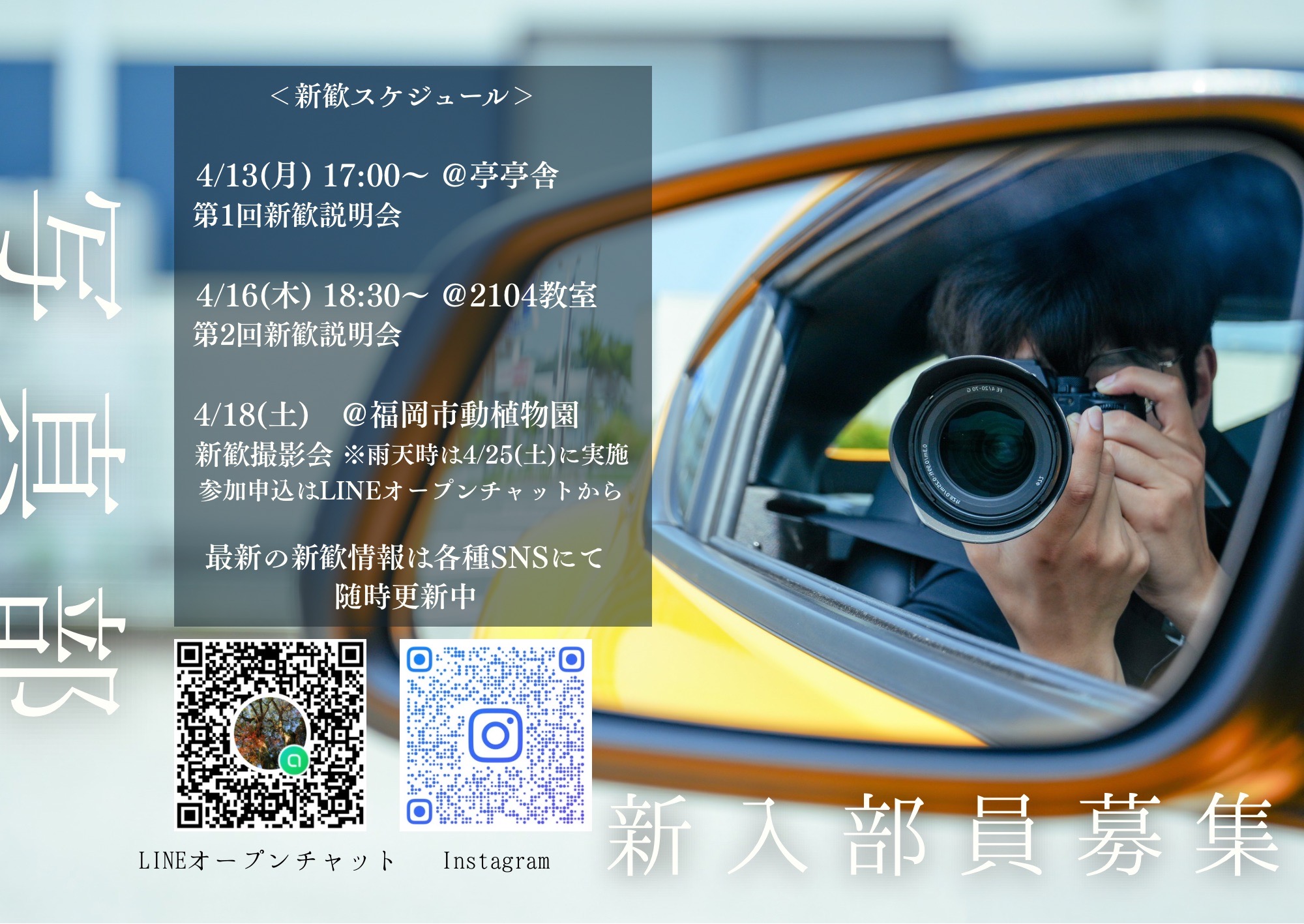 九大写真部では、写真を趣味にしたい人、カメラが好きな人、友達を作りたい人など、私たちと一緒に活動する仲間を募集しています!新入生の皆さんに向けて様々な活動をご用意していますので、ぜひご参加ください!